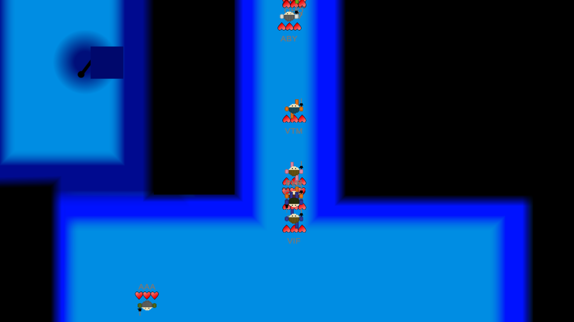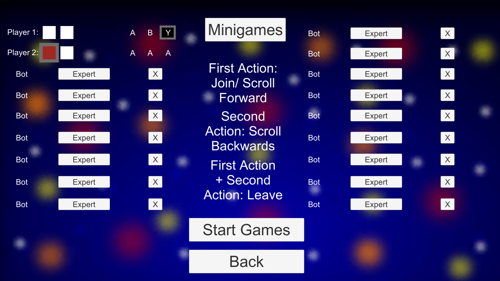 In the lobby, players can enter by pressing First Action, and can leave by pressing First Action + Second Action. They can choose their colors, and their 3 character nickname. When everyone is done, the host can choose what minigames to play, or let the system to decide a random amount. Teams can be activated, and bots with difficulty ranging from easy to expert can be also added.