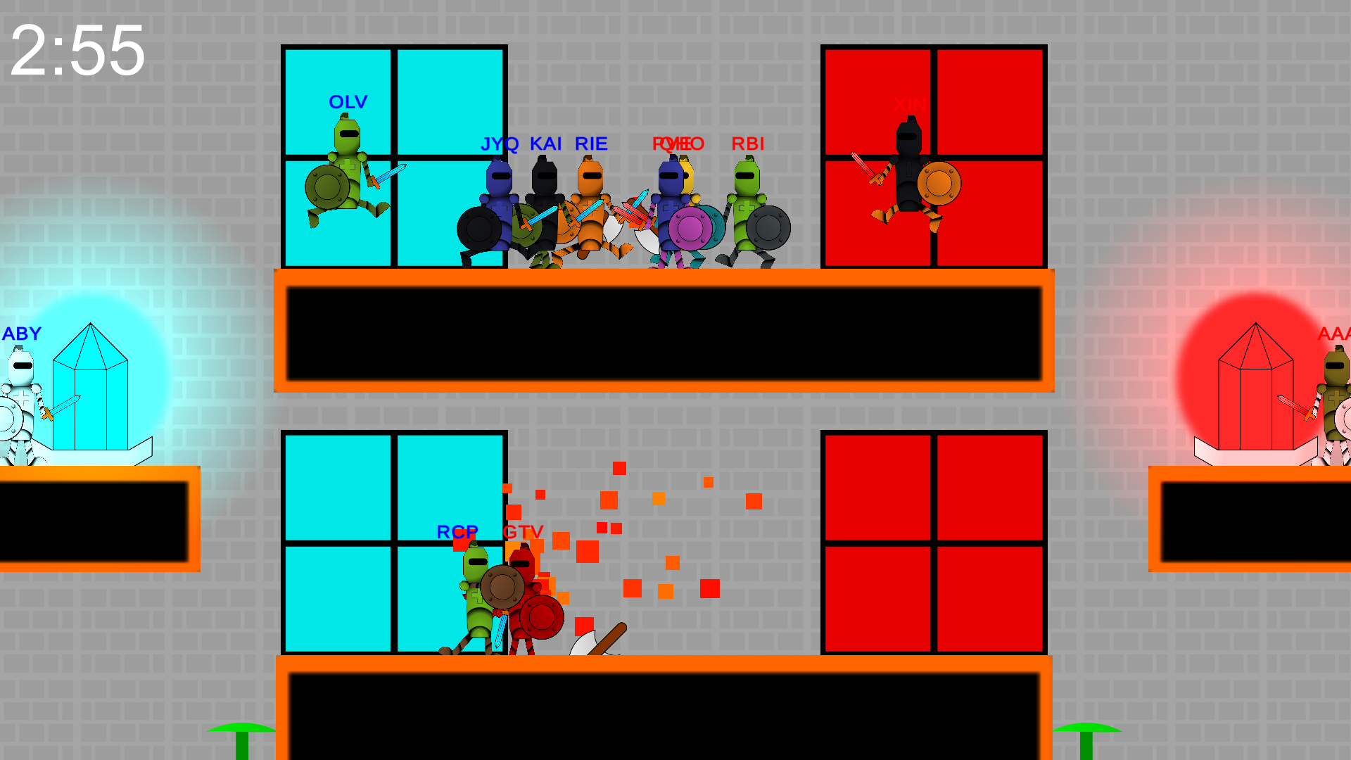 In NexusDefenders, players are split into 2 teams. The objective is to deal the most damage possible to the enemy base in 3 minutes. You can attack by pressing First Action, and you can throw an axe by pressing Second Action.