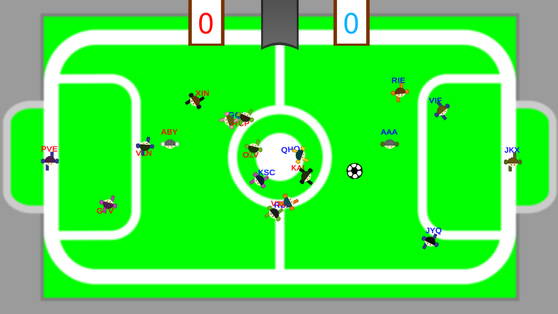 In Footballers, players are split into 2 teams. Your objective is to score 3 goals on the enemy team. You can pass the ball by pressing First Action, or you can shoot the ball by pressing Second Action.