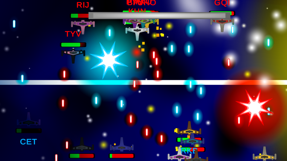 In SpaceShooter, players are split into 2 teams. The objective is to eliminate the enemy team. You can shoot a laser by pressing First Action, and you can shoot your ultimate by pressing Second Action.