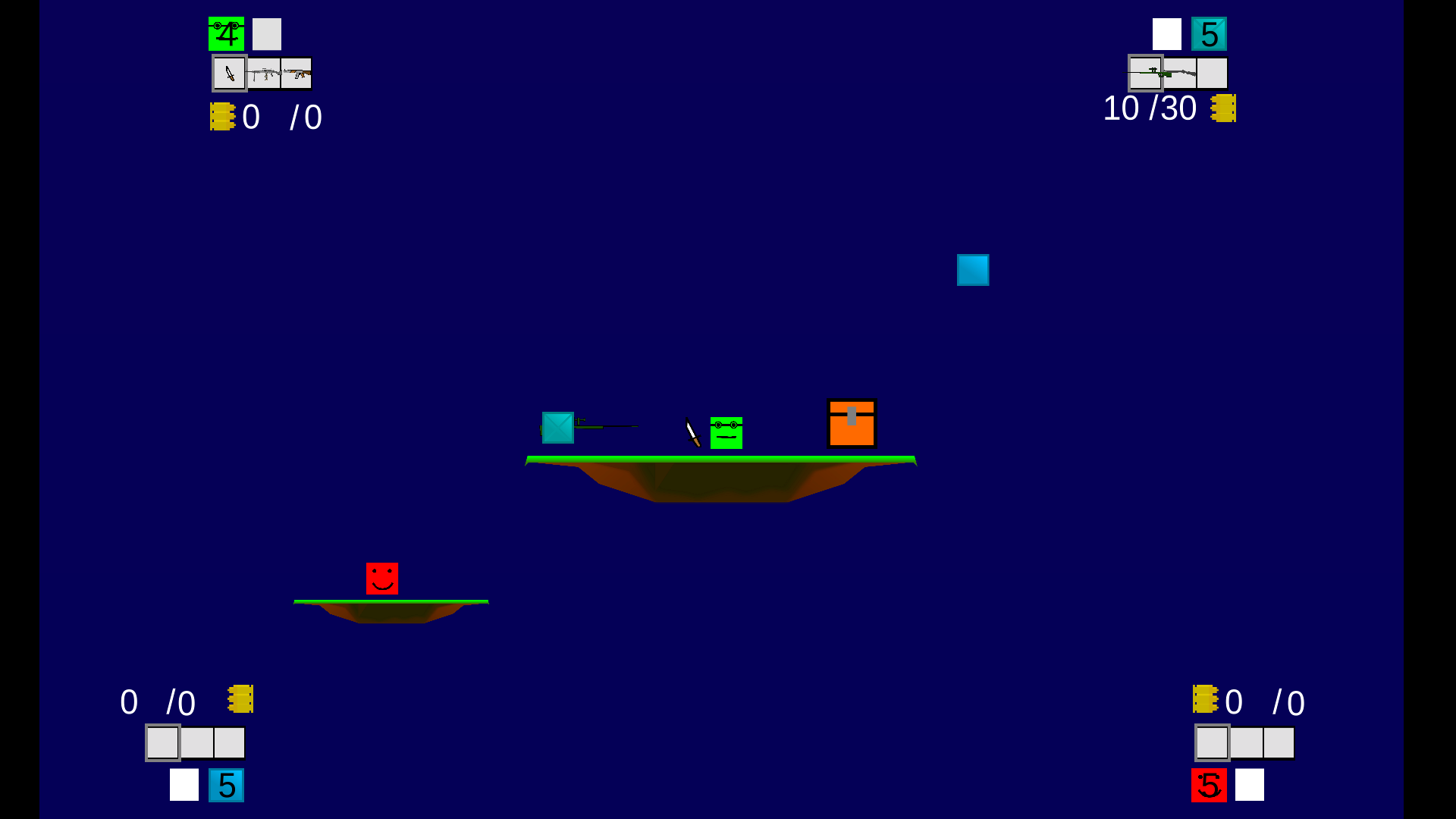 After selecting a map, all players are placed on a platform. The players can immediatly start moving, while chests are falling down from the sky. If a player touches one of these chests, they are instantly given a new weapon, unless they have a full inventory. One of these weapons can be: